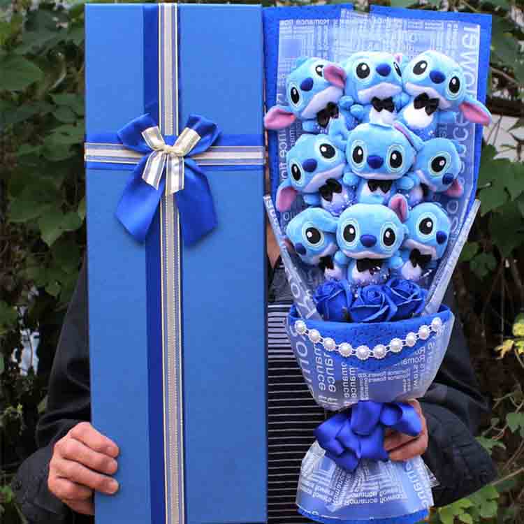 एका गोंडस स्टिच कार्टून पुष्पगुच्छ पॅकेजमध्ये एकाच रंगाच्या नऊ सुंदर कृत्रिम फुलांमध्ये वसलेले सहा मोहक स्टिच आकडे आहेत. दुसरा नऊ स्टिच सोबतींसह येतो आणि पुष्पगुच्छाचा तळाशी त्याच रंगाच्या तीन कृत्रिम फुलांनी सजविला जातो.