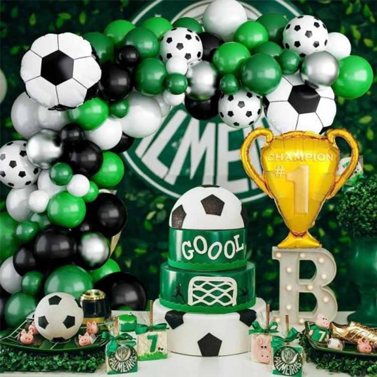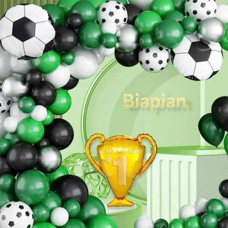 फुटबॉल थीम असलेल्या बलून आर्क किटमध्ये हिरवे, काळे आणि पांढरे फुगे हे मुख्य घटक आहेत, ज्यामध्ये फुटबॉलच्या आकाराचे फुगे एक विशिष्ट थीम असलेली सजावटीची पार्श्वभूमी तयार करण्यासाठी अलंकार म्हणून जोडले जातात. हे उत्पादन विशेषत: फुटबॉल इव्हेंट्स, फुटबॉल-थीम असलेल्या पार्ट्या, फुटबॉल क्लब क्रियाकलाप इत्यादींसाठी डिझाइन केलेले आहे, जे एक चैतन्यशील वातावरण तयार करते आणि अधिक लोकांना फुटबॉल क्रियाकलापांवर प्रेम करण्यास प्रेरित करते.