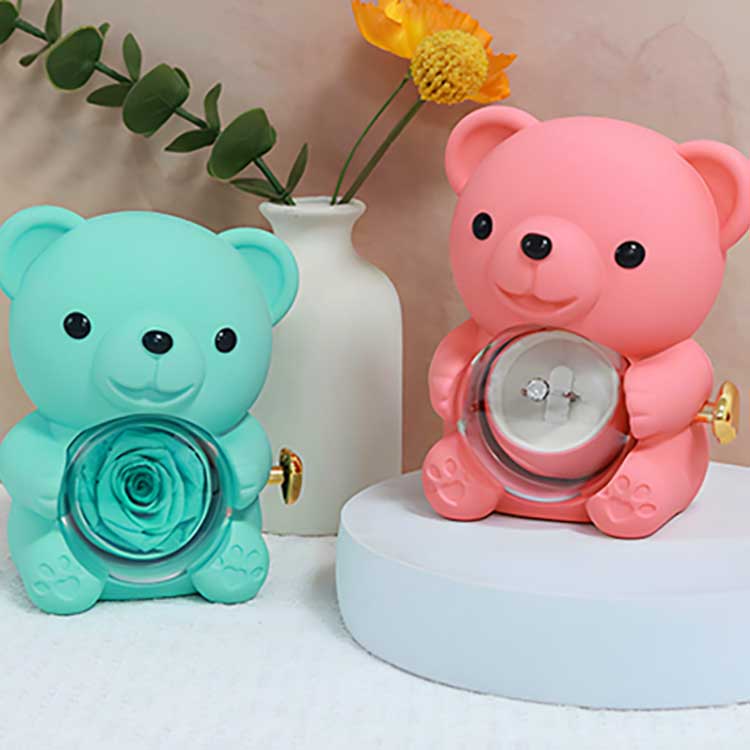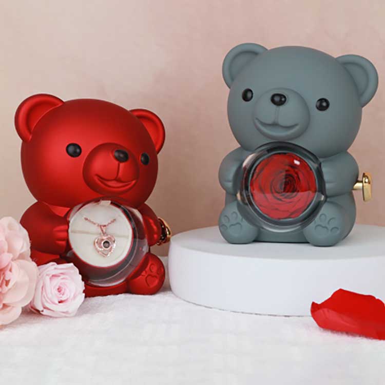 हा हग बेअर रोझ ज्वेलरी बॉक्स डेस्क, बुकशेल्फ किंवा बेडसाइड टेबलवर प्रदर्शनासाठी वापरला जातो. मध्यभागी संरक्षित गुलाब हे त्याचे सर्वात लक्षवेधी वैशिष्ट्य आहे. गुलाब उघडल्याने दागिने, अंगठ्या किंवा किपसेक ठेवण्यासाठी एक डबा दिसून येतो.