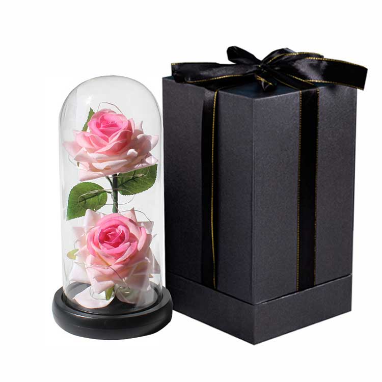 काचेच्या घुमटाचे संरक्षण करण्यासाठी आम्ही चमकदार आकाशगंगा गुलाबाच्या आत फोम पॅकेजिंग वापरतो. बाह्य पॅकेजिंगमध्ये एक मानक काळा किंवा गुलाबी बॉक्स आणि उच्च-एंड ब्लॅक गिफ्ट बॉक्स समाविष्ट आहे. ग्राहक त्यांच्या पसंतीचे पॅकेजिंग निवडू शकतात; प्रीमियम पॅकेजिंग उच्च विक्री किमती आणि अधिक नफा मिळविण्यास अनुमती देते.