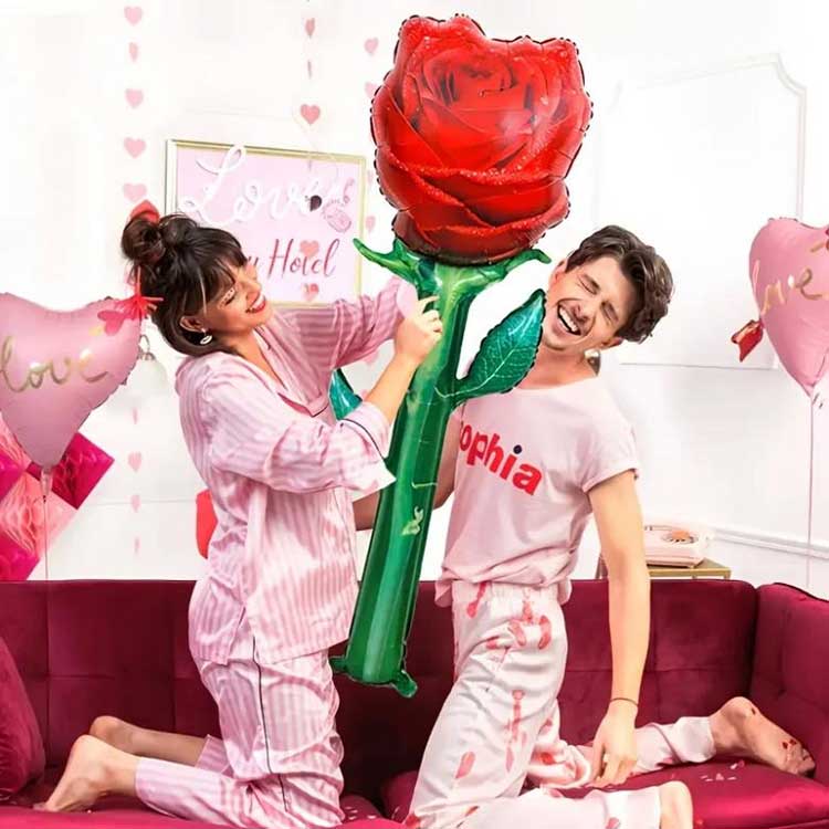 हाय-डेफिनिशन प्रिंटिंग: गुलाबाच्या आकाराचे फॉइल फुगे वेगळे आहेत, रंग चमकदार आहे, फिकट होत नाही, संपूर्ण कस्टमायझेशनला समर्थन देते.